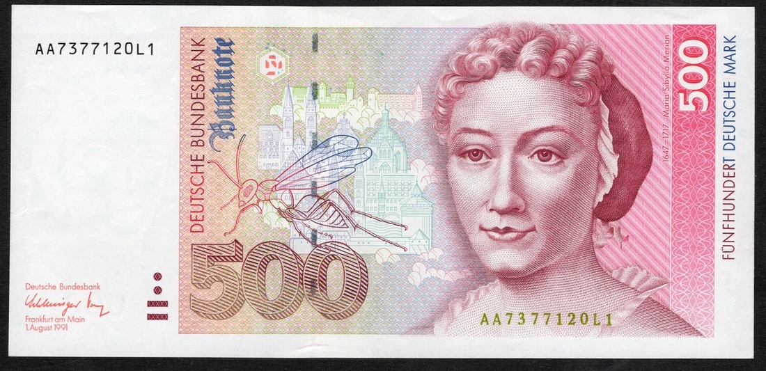 Germany. Bundesrepublik. Deutsche Bundesbank. 500 Deutsche Mark. 1991. P-43. No. AA7377120L1. Red-violet and blue on multicolor. Narie Sibylla Merian portrait at right; Dandelion with butterfly and caterpillar on back. EF+.