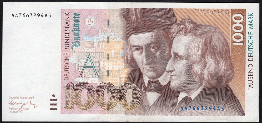 Germany. Bundesrepublik. Deutsche Bundesbank. 1,000 Deutsche Mark. 1991. P-44a. No. AA7663294A5. Brown-violet and blue-green on multicolor. The Brothers Grimm at right, city drawing at center; Deutsches Wörterbuch over building on back. Extremely Fine.