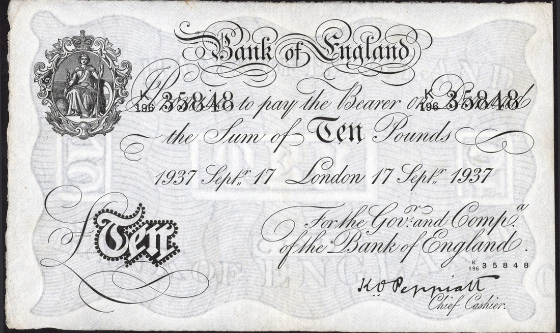 Great Britain. Bank of England. 10 Pounds. London, 17 Sept. 1937. WWII Operation Bernhard Forgery. Cf.P-336a. No. K/196 35848. Britannia upper left. About Extremely Fine.