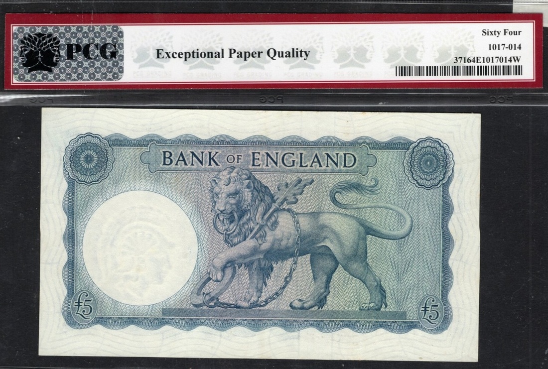 Great Britain. Bank of England. 5 Pounds. ND (1957-67). P-371. No. C77 516451. Blue and multicolor. Britannia head at left, St. George and dragon lower center; Lion with key on back. PCG Uncirculated 64 EPQ.
