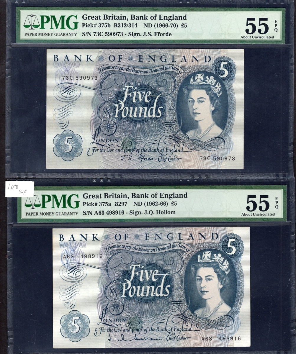 Great Britain. Bank of England. Pair of 5 Pounds notes. ND (1962-65; 1966-70). P-375a, b. Signed: J.Q. Hollom; J.S. Fforde. Deep blue, violet. Queen Elizabeth II portrait at right; Britannia back center. Both PMG About Uncirculated 55 EPQ. [2]
