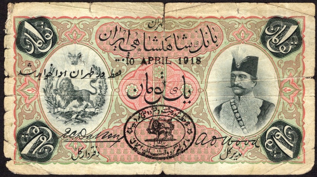 Iran. Qajar. Imperial Bank of Iran. 1 Toman. 10 April 1918. Payable at Teheran. P-1b. Black serial no. A/M 025529. Black on pink and light green. Portrait of Nasir al-Din Shah at right, Arms left; Arms at center of green back. Tear at mid top margin into bank title. About Very Good.
