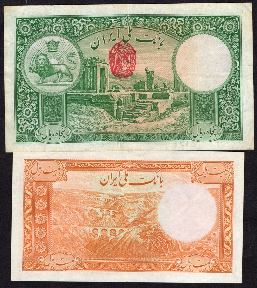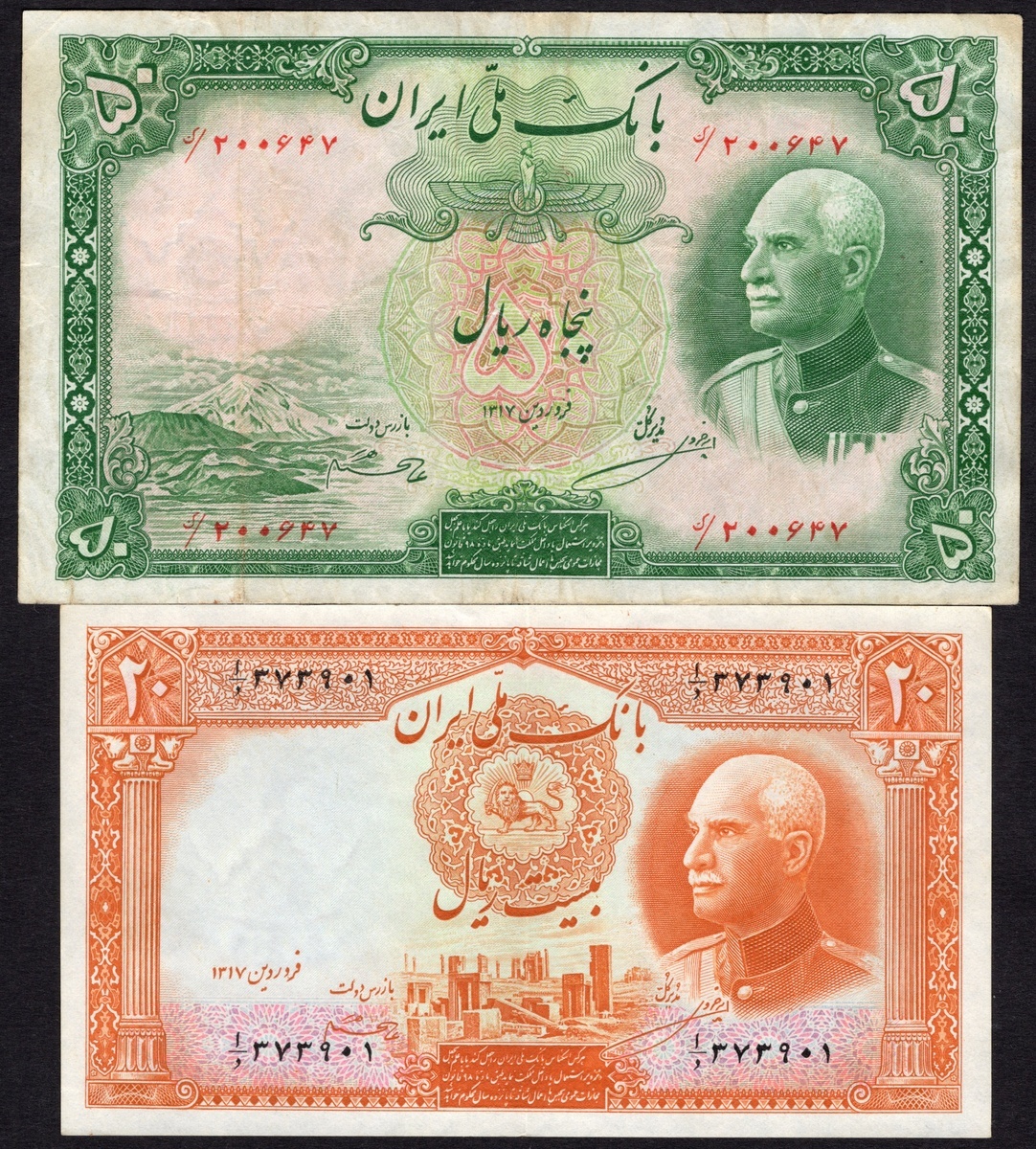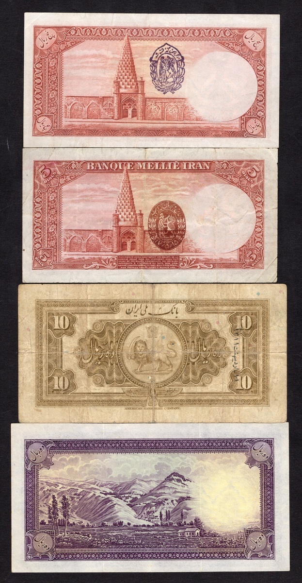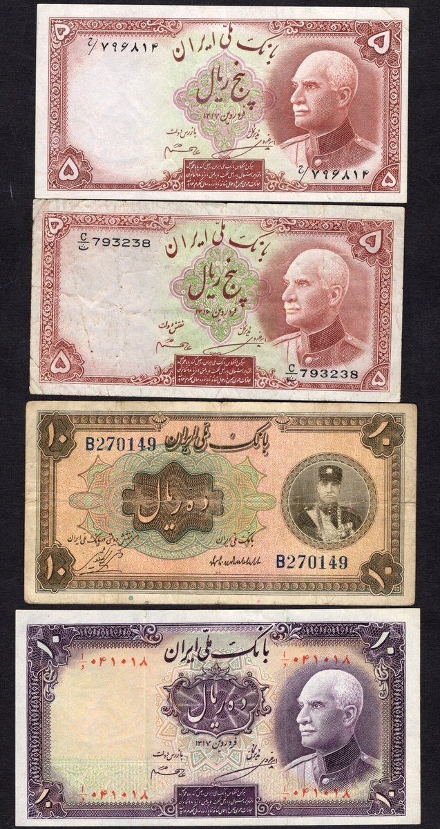 Iran. Bank Melli Iran. 1930s lot. Includes: 10 and 100 Rials. SH 1311, 1312. P-19, 28a. Uniformed portrait of Reza Shah wearing cap at right. Tiny rent near center, Fine; and Very Good; 5 (2), 10, 20, 50, 100 Rials. The first SH 1316, the others SH 1317. P-32a, 32Ae, 33Aa, 34Ab, 35Af, 36Aa Uniformed, bare-headed portrait of Reza Shah at right. Fine-Very Fine. [8]