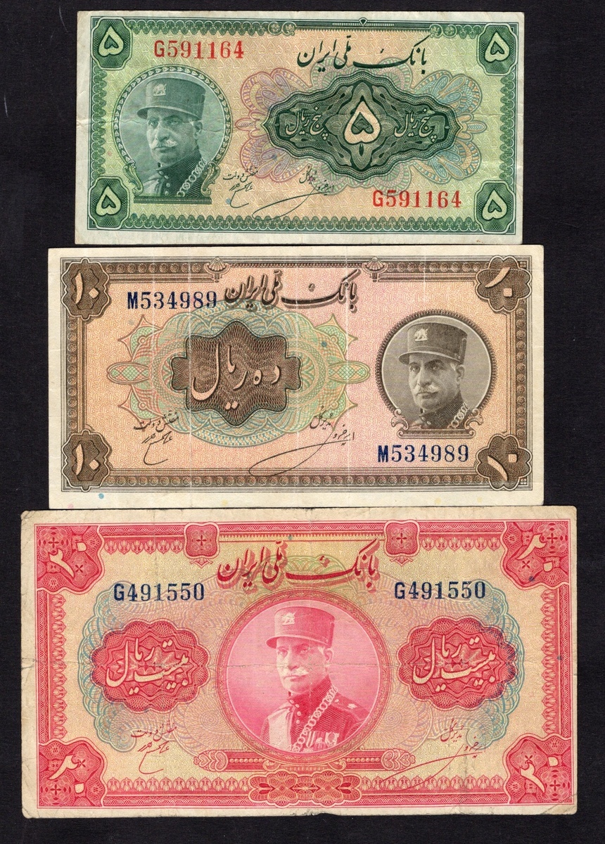 Iran. Bank Melli Iran. 5, 10 and 20 Rials. ND (1933-1934). P-24, 25b, 26b. Uniformed portrait of Reza Shah wearing cap at left, right and center; Arms on back. ABNCo. The latter Fine, the others About Very Fine. [3]