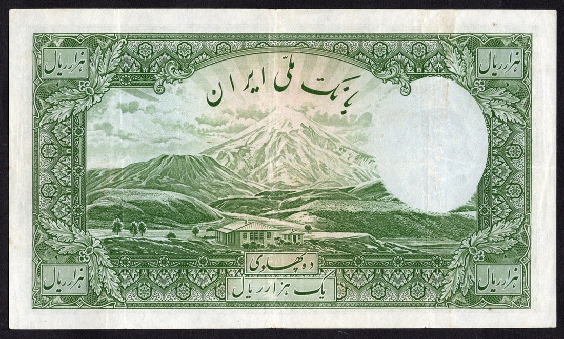 Iran. Bank Melli Iran. 1,000 Rials. AH 1317 (1938 AD). P-38Aa. No. B692958. Green on multicolor. Reza Shah portrait, bare-headed, and ¾ left, at right; Mount Damawand back center. Choice Very Fine.