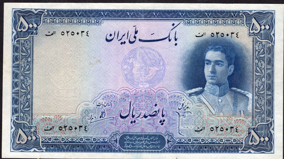 Iran. Bank Melli Iran. 500 Rials. ND (1944). P-45. No. 525034. Dark blue and purple. Unformed portrait of Mohammad Reza Shah at right, ancient winged horse at center; Ruins of Persepolis on back. About Extremely Fine.