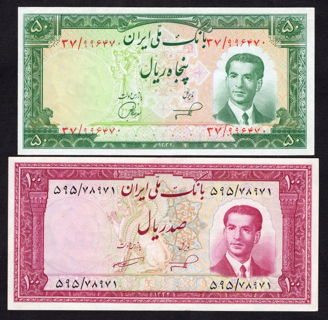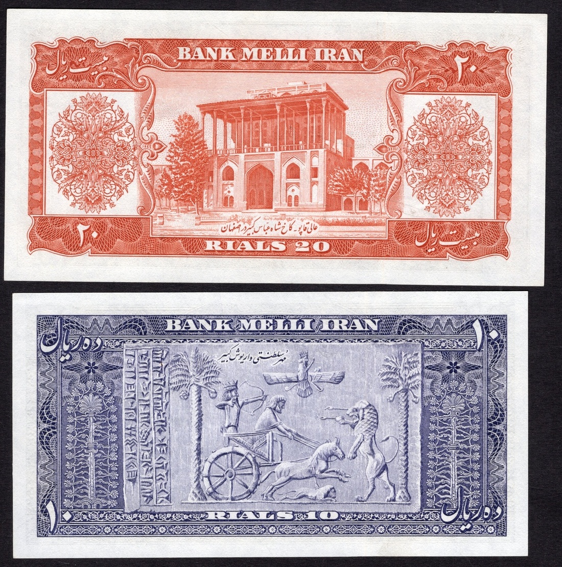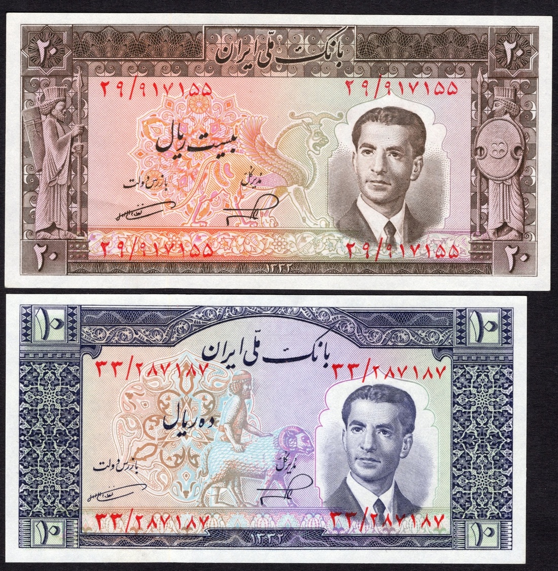 Iran. Bank Melli Iran. 10, 20, 50, and 100 Rials. SH 1332 (1953). P-59-62. Portrait of Muhammad Reza Shah in civilian attire facing ¾ left at right; Royal Seal of Darius; Ali Ghapoo; Palace of Darius; Darius in court sculpture. Slight teller handling. Uncirculated. [4]