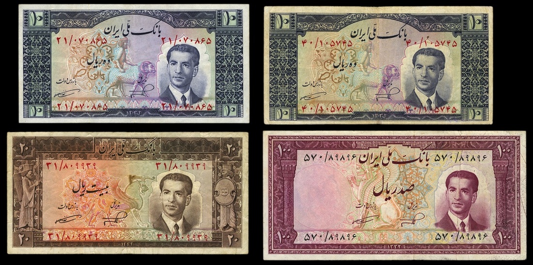 Iran. Pahlavi. Bank Melli Iran. Group of SH 1332 (1953) issues. 10 (2), 20, and 100 Rials. P-59, 60, 62. VF-EF. [4]