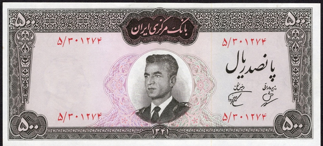 B>Iran. Bank Markazi Iran. 500 Rials. SH 1341 (1962). P-74. No. 5/301274. Black on pink and multicolor. Uniformed portrait of Muhammad Reza Shah at center; Pair of ancient winged bulls back center. Crisp Uncirculated.