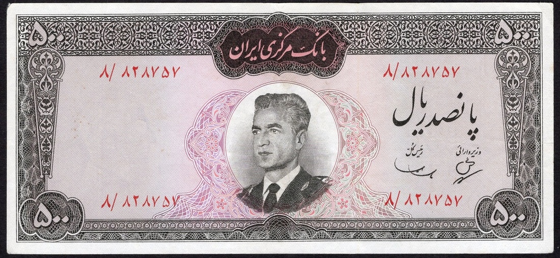 Iran. Bank Markazi Iran. 500 Rials. ND (1965). P-82. No. 8/828757. Black on pink and purple. Uniformed portrait of Muhammad Reza Shah at center; Pair of ancient winged bulls back center. Tiny cornertip nick. Extremely Fine.