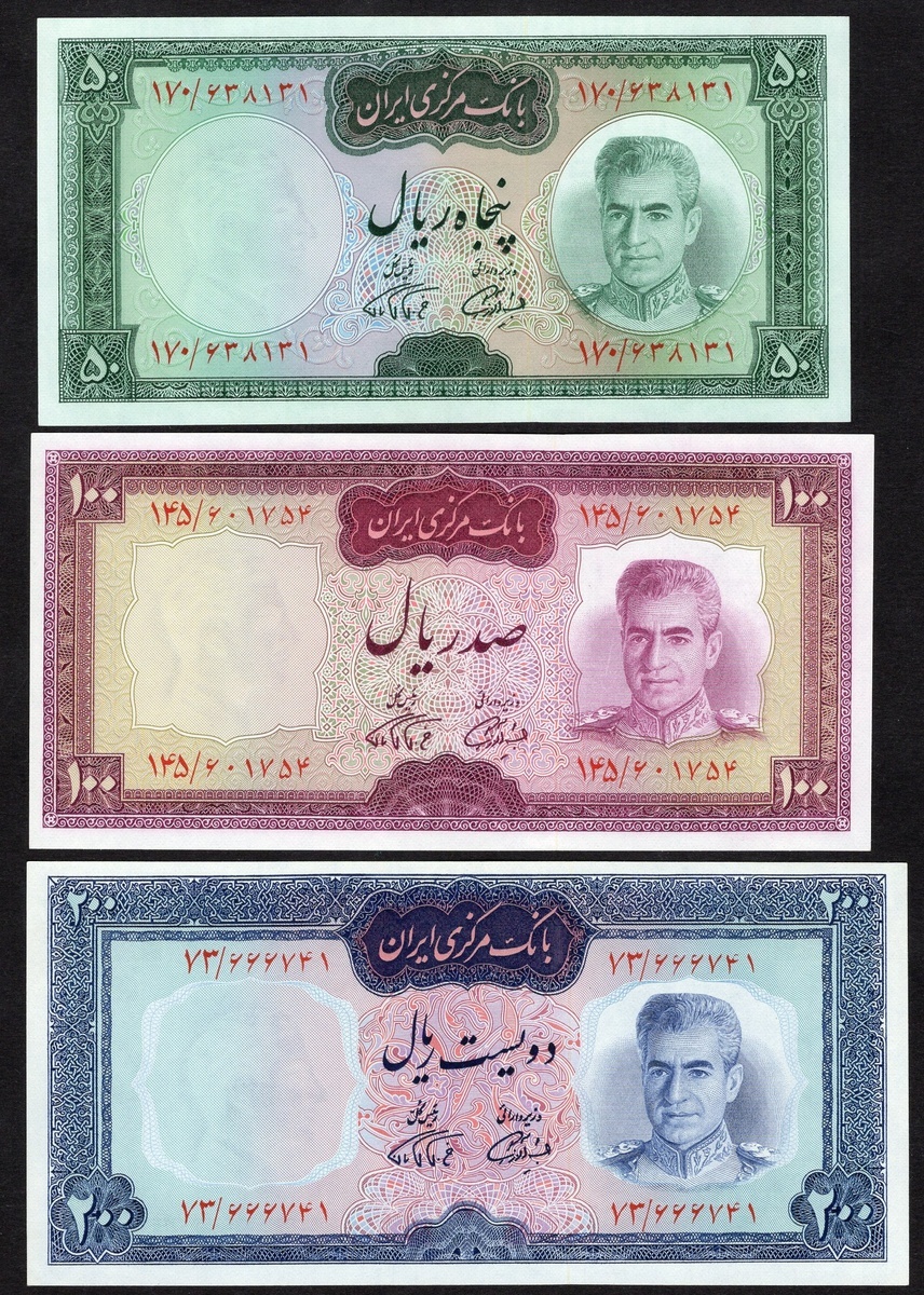 Iran. Bank Markasi Iran. 20 (3), 50 (11), 100 (2) and 200 Rials. P-84, 85a (9), b (2), 86b, 87b. Older uniformed portrait of Muhammad Reza Shah at right. Generally Crisp Uncirculated. [17]
