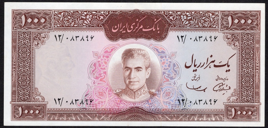 Iran. Bank Markazi Iran. 1,000 Rials. ND (1969). P-89. No. 12/083896. Brown on red and multicolor. Uniformed older portrait of Muhammad Reza Shah at center; Tomb of Hafez in Shiraz on back. Uncirculated.