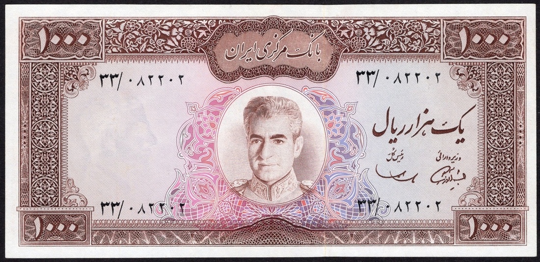Iran. Bank Markazi Iran. 1,000 Rials. ND (1971-72). P-94a. Light panel. No. 33/082202. Signed: Samii and Amouzegar. Brown on red and multicolor. Uniformed older portrait of Muhammad Reza Shah at center; Tomb of Hafez in Shiraz on back. Crisp Uncirculated.