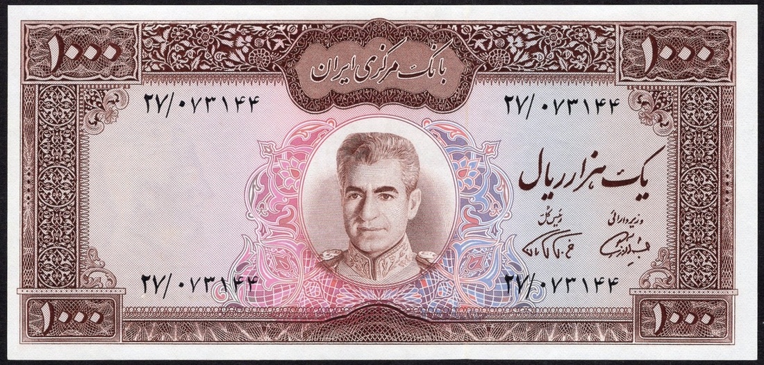 Iran. Bank Markazi Iran. 1,000 Rials. ND (1971-72). P-94b. Light panel. No. 27/073144. Signed: Famanfarmaian and Amouzegar. Brown on red and multicolor. Uniformed older portrait of Muhammad Reza Shah at center; Tomb of Hafez in Shiraz on back. Crisp Uncirculated.