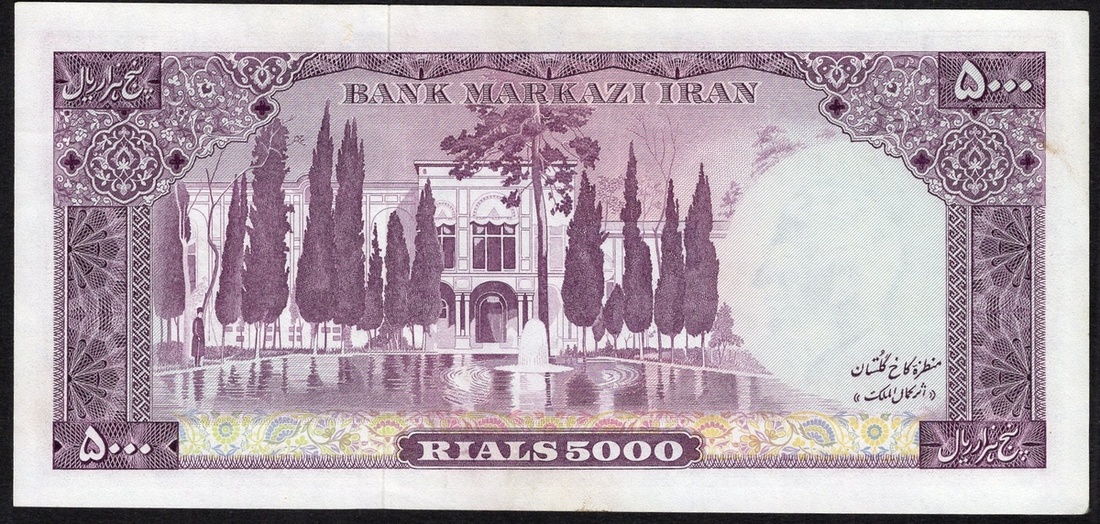 Iran. Bank Markazi Iran. 5,000 Rials. ND (1969). P-95b.Light panel No. 6/733597. Signed: Jahanshahi and Amouzegar. Purple on red and multicolor. Uniformed older portrait of Muhammad Reza Shah at center; Golestan Palace, Tehran on back. Uncirculated.