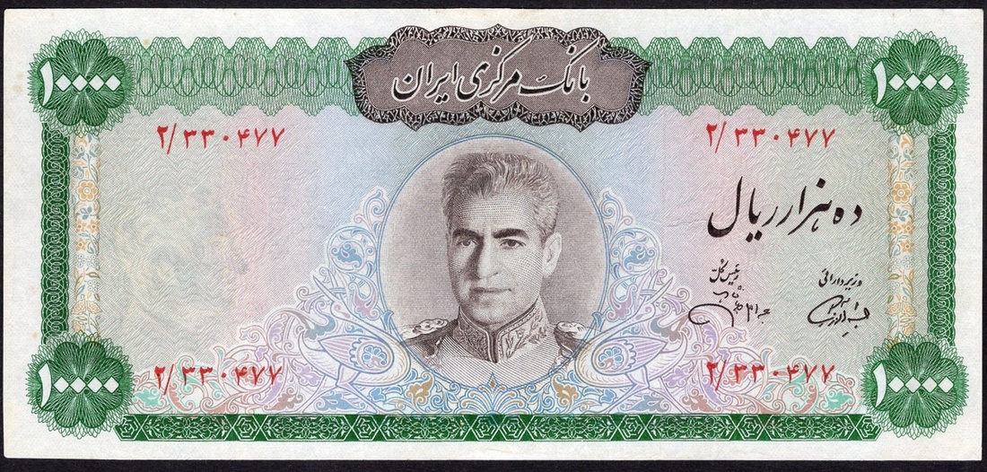 Iran. Bank Markazi Iran. 10,000 Rials. ND (1972-73). P-96b. Light panel. No. 2/330477. Signed: Jahanshahi and Amouzegar. Dark green, brown on multicolor. Uniformed older portrait of Muhammad Reza Shah at center; National Council of Ministries on back. Crisp Uncirculated.