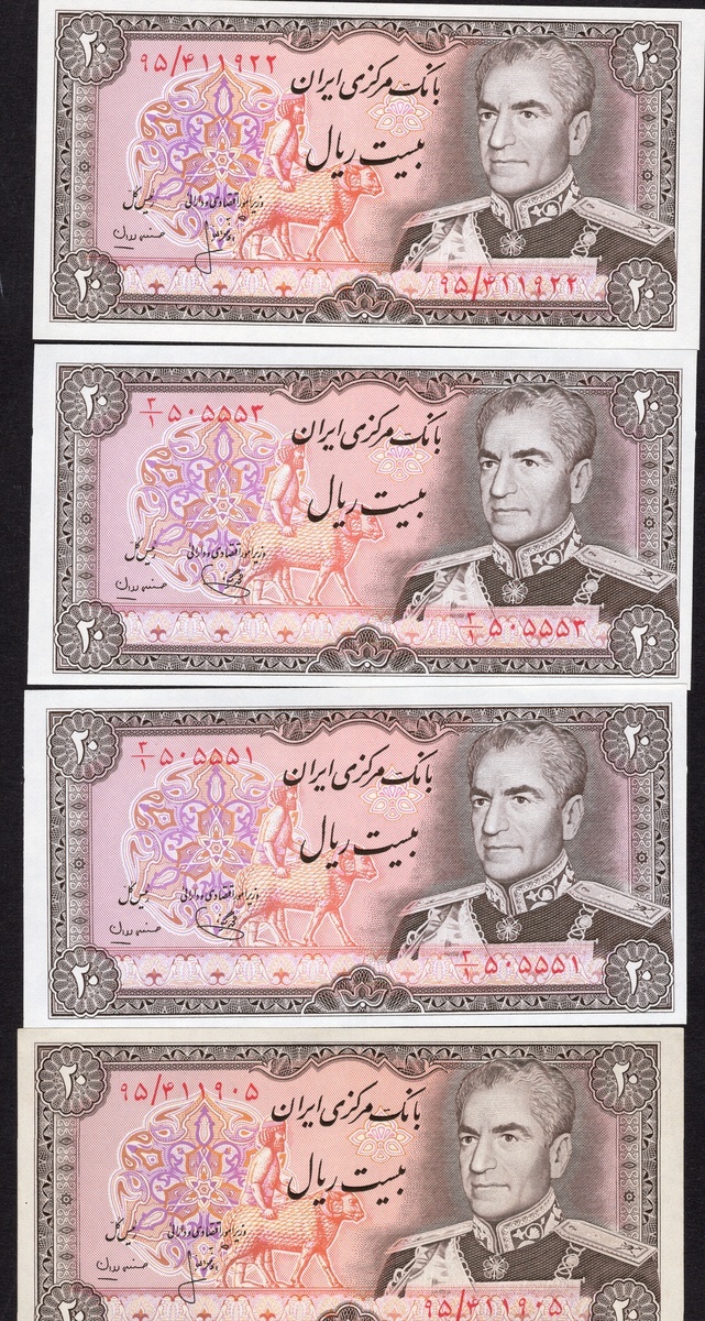 Iran. Bank Markazi Iran. Large lot of 20 Rials. (ND (1974-79). P-100b (7), c (41). Brown on orange, lilac and multicolor. Uniformed portrait of Muhammad Reza Shah at right; Amir Kabir Dam on back. Crisp Uncirculated. [48]