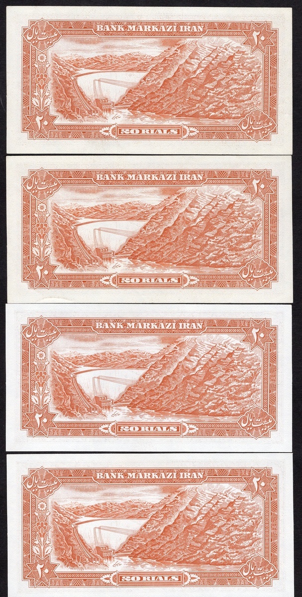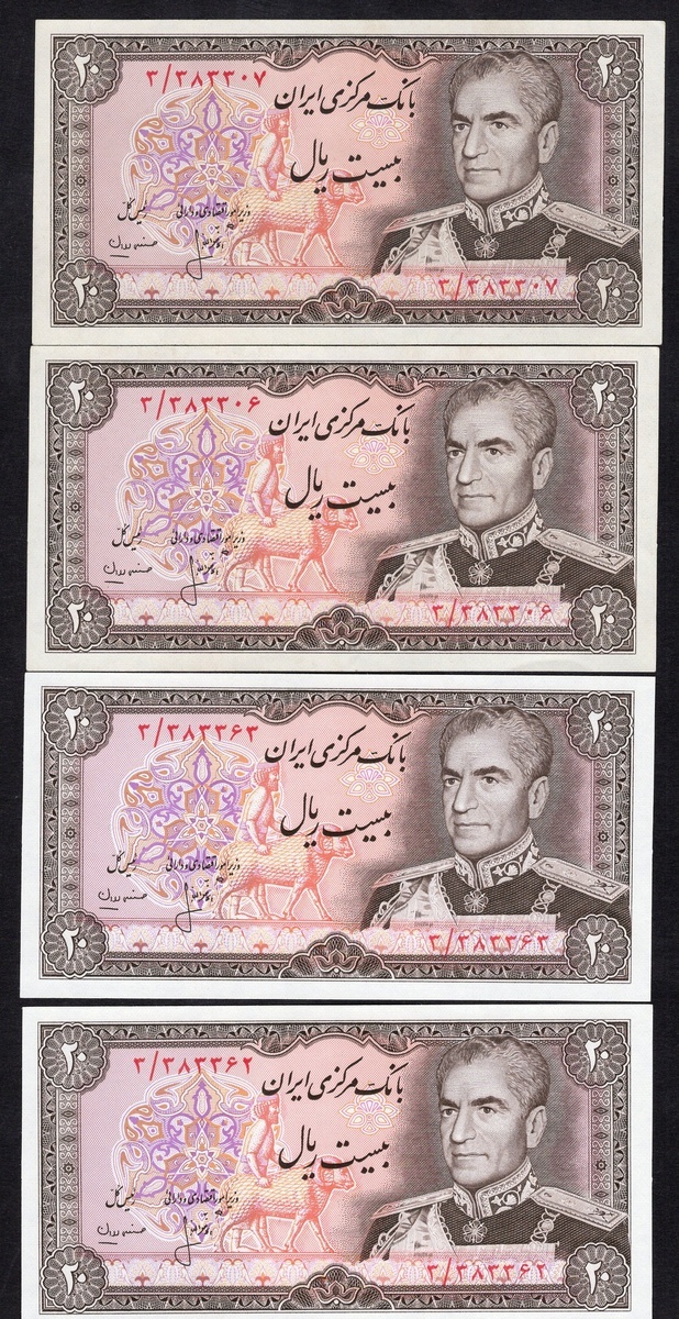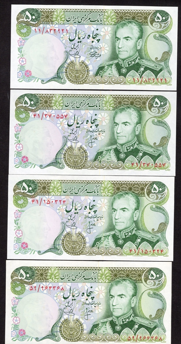 Iran. Bank Markazi Iran. ND (1974-79) group: 20 Rials. P-100c (4); and 50 Rials 101b (6), c (3), e (5). Uniformed portrait of Muhammad Reza Shah at right. Crisp Uncirculated. [18]