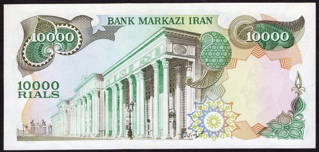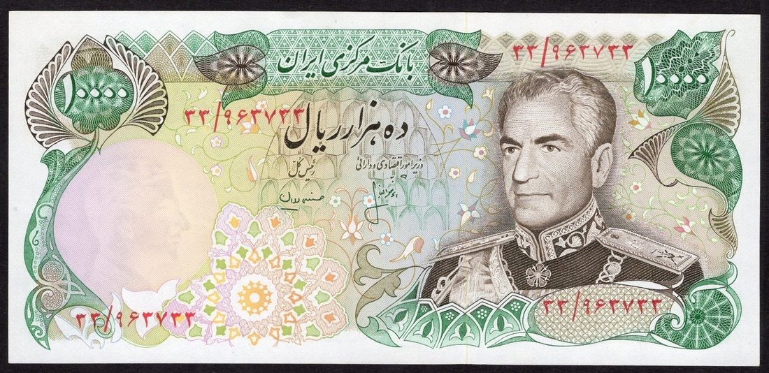 Iran. Bank Markasi Iran. 10,000 Rials. ND (1974-79). P-107b. No. 33/963733. Signed: al-Mehran and Ansary. Dark brown and green on multicolor. Uniformed older portrait of Muhammad Reza Shah at right; National Council of Ministries on back. Uncirculated.