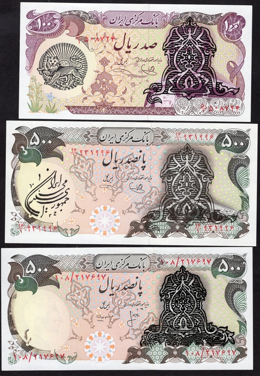 Iran. Islamic Republic. Provisional Issues. Type I: 20, 50, 100 (4), 500 (2, var) Rials. P-110b, 111b, 112b, 114a, c; Type II. 50 (2), 100 (3) Rials. P-117a, 118b; Type III. 50 Rials (2). P-123b; also 20 Rials, P-100b with simple black overprint "X" defacing the Shah's image. Crisp Uncirculated. [16]