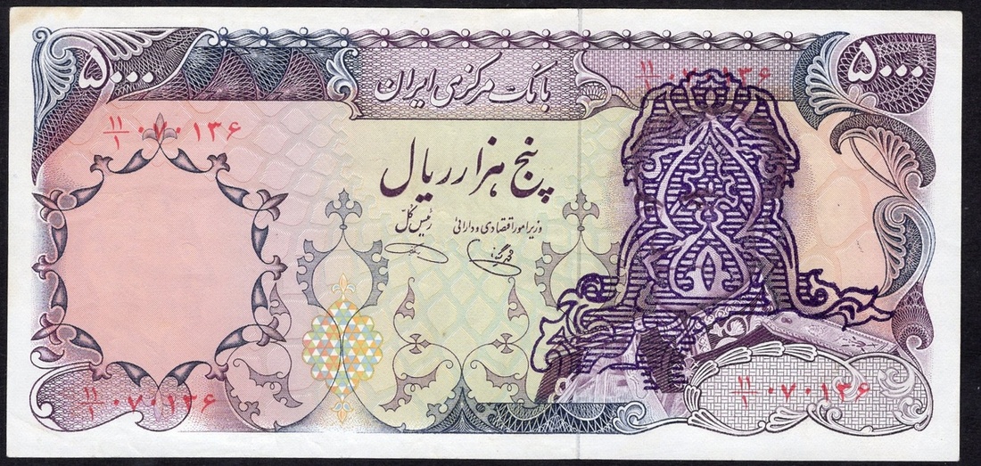 Iran. Islamic Republic. Provisional Issues. Type I. 5,000 Rials. P-116. Rare. Light teller handling. About Uncirculated.