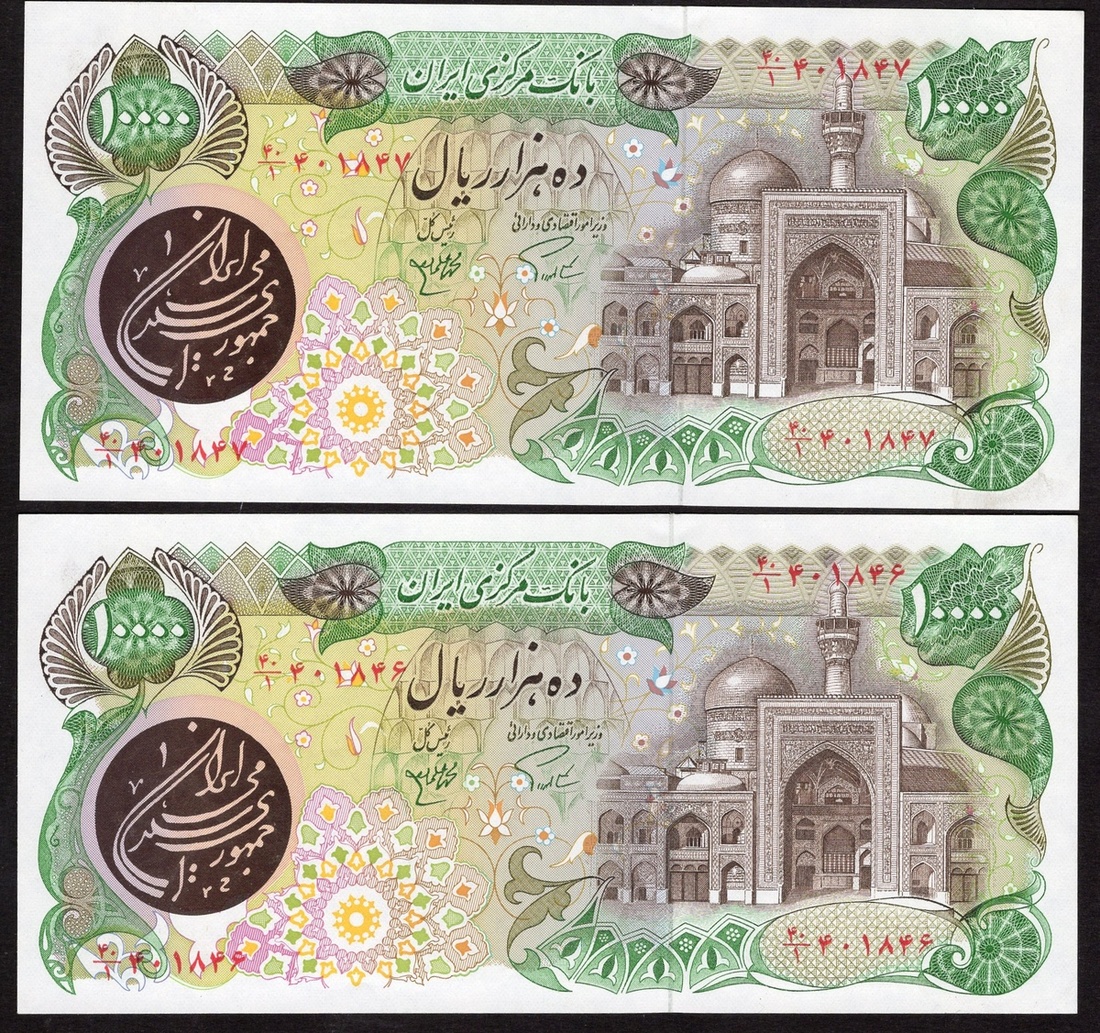 Iran. Islamic Republic. First issue ND 1981. Sequential Pair of 10,000 Rials P-131. Deep green, brown on multicolor. Imam Reza Mosque at right; National Council of Ministries on back. Uncirculated. [2]