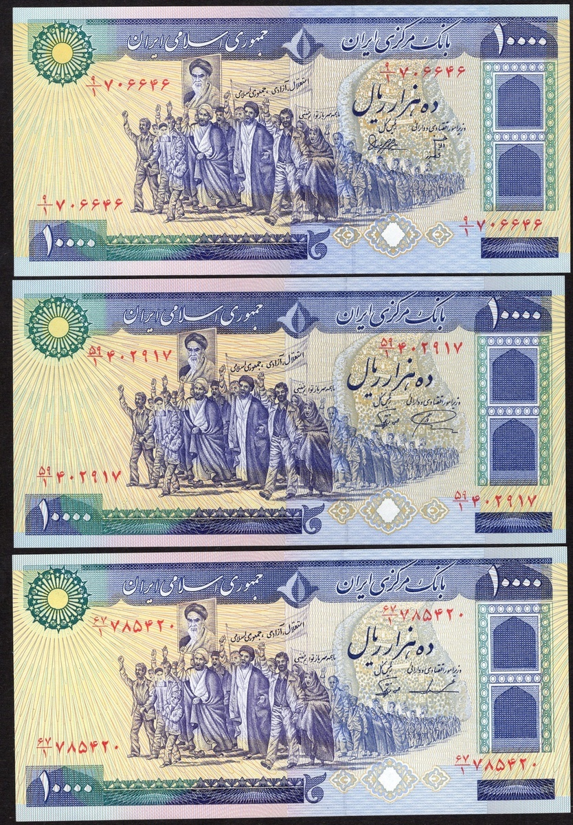 Iran. Islamic Republic. Bank Markasi Iran. Varietal trio of 10,000 Rials. ND (1981). P-134a, b, c. Dark blue and green on yellow and multicolor. Mullahs leading marchers carrying posters of Ayatollah Khomeini; Imam Reza shrine in Mashhad on back. Crisp Uncirculated. [3]