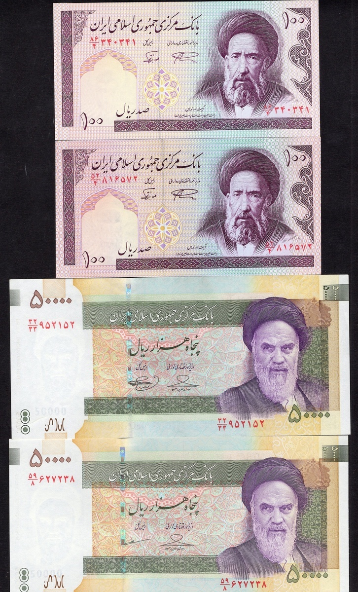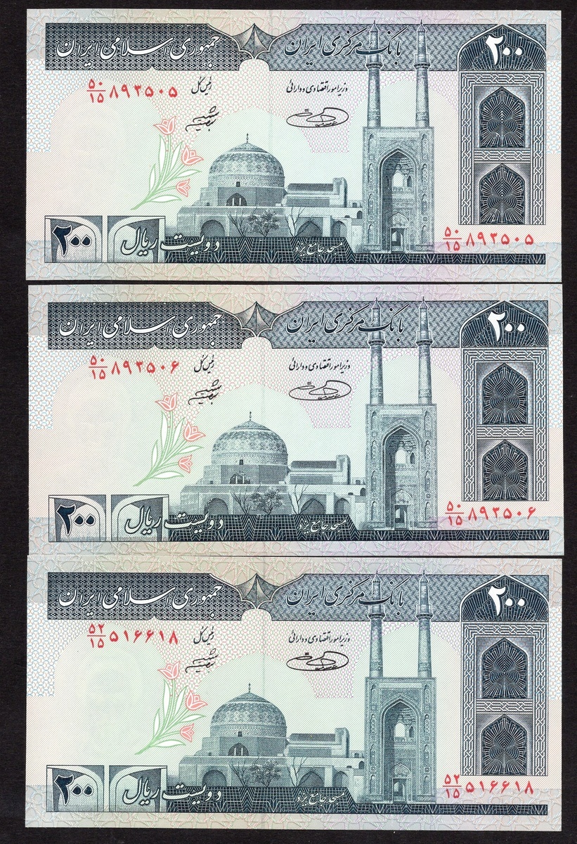 Iran. Islamic Republic. Large stock album of Banknotes. P-135 (10), 136 (25), 137 (24), 138 (24), 140 (22), 141 (17), 143 (31), 144 (32), 145 (39), 146 (25), 147 (13), 148 and 153 (39),149 (21),155; Post 2014-15 issues -- 5,000 Rials ceramics on back (15), 10,000 Rials (10), 20,000 Rials al-Aqsa on back; with Khomeini and Persian and western numeral -- 10,000 (10), 20,000 (4), 50,000 (4), 100,000 Rials; Central Bank - Iran Cheques -500,00 (5), 1 Million (5), 2 Million Rials (2), modified designs - 500,000 purple, pink (4), 1 Million (4) Rials, additional Central Bank Iran Cheques (7). Generally Crisp Uncirculated; also Democratic - Socialist Vietnam (5) small notes. Should be viewed.