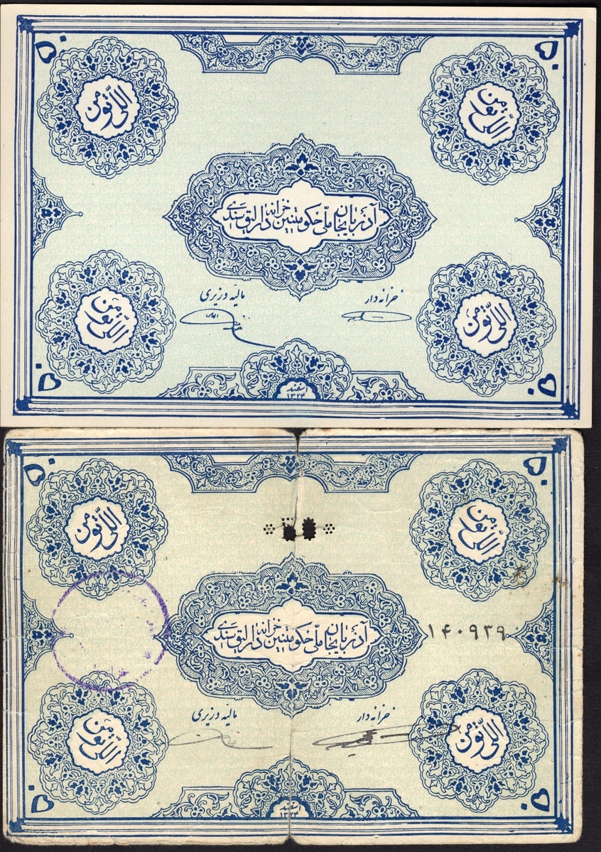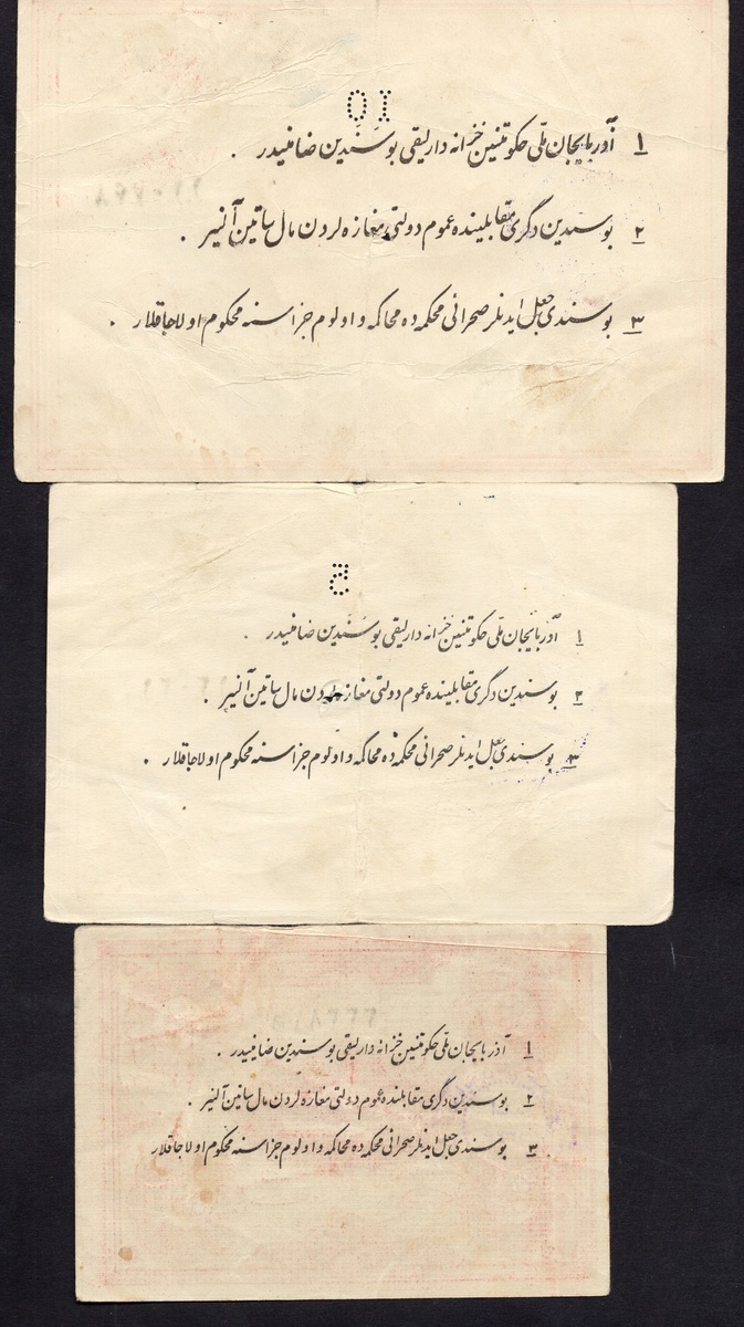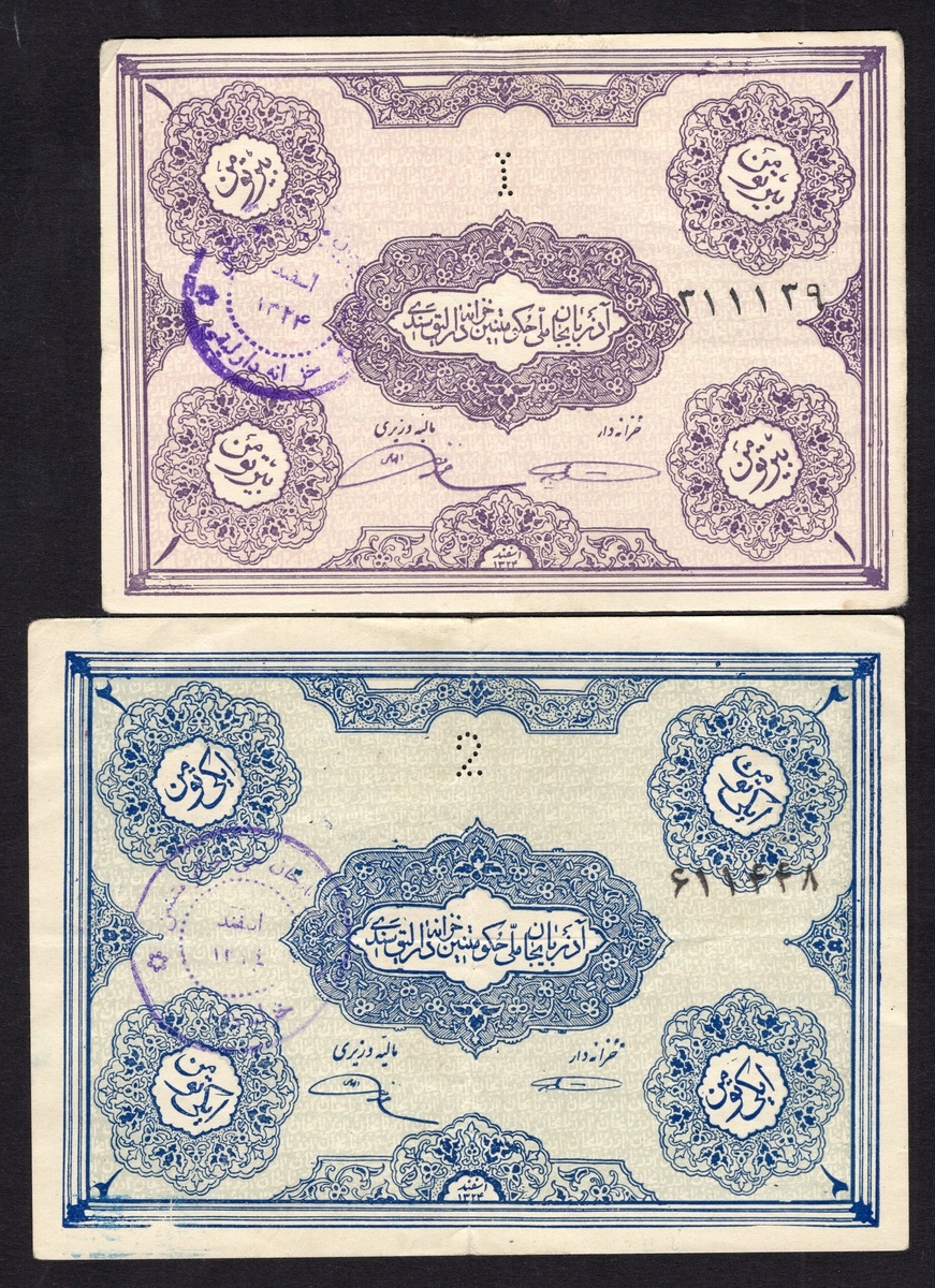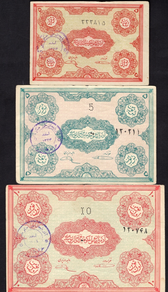 Iranian Azerbaijan. 5 Krans, 1 Toman, 2, 5, 10 and 50 (2) Tomans. P-S101, S102a, S103a, S104a, S105a, S106a, r. The 5 Krans to 10 tomans, Fine-VF; the P-S106a centersplits into design, VG; the P-S106r Uncirculated. [7]