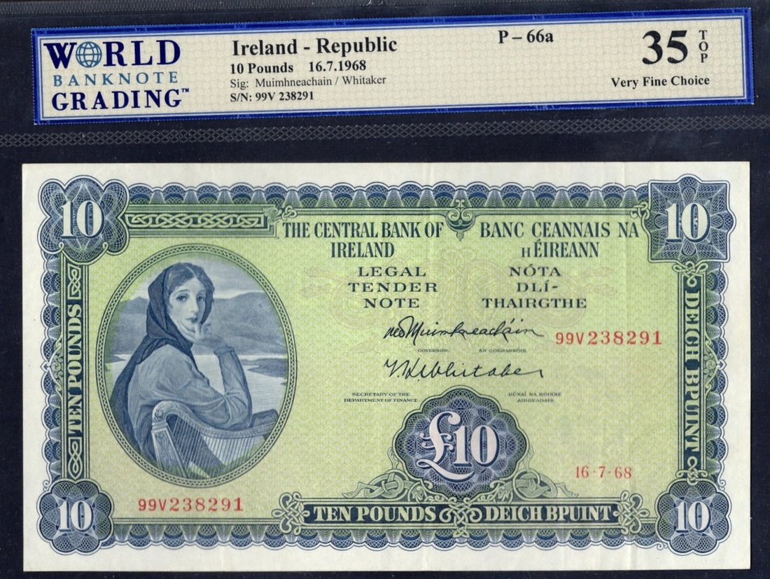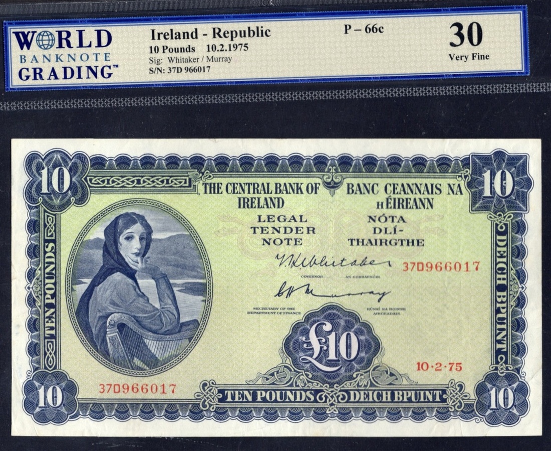 Ireland. Central Bank of Ireland - Banc Ceannais na h Eireann. Pair of 10 Pounds notes. 16.7.1968, 10.2.1975. P-66a, 66c. Blue, pale green. Lady Lavery at left; Celtic rivergod on back. WBG Very Fine Choice 35 TOP, WBG Very Fine 30. [2]