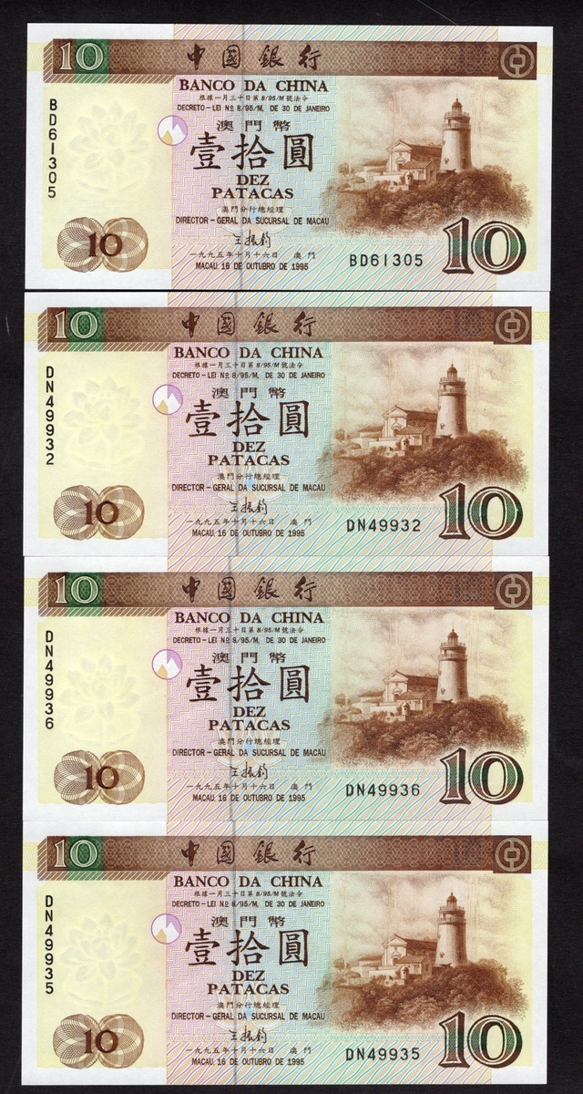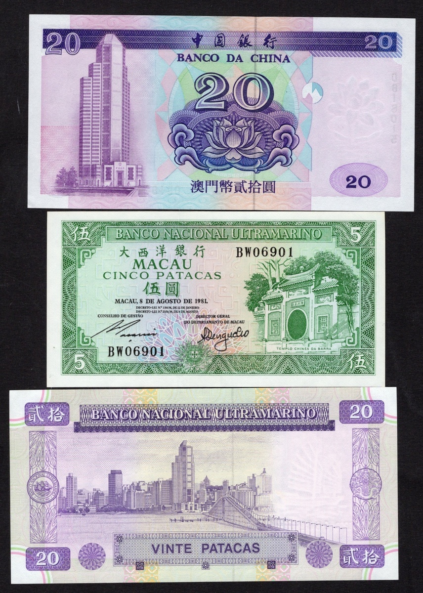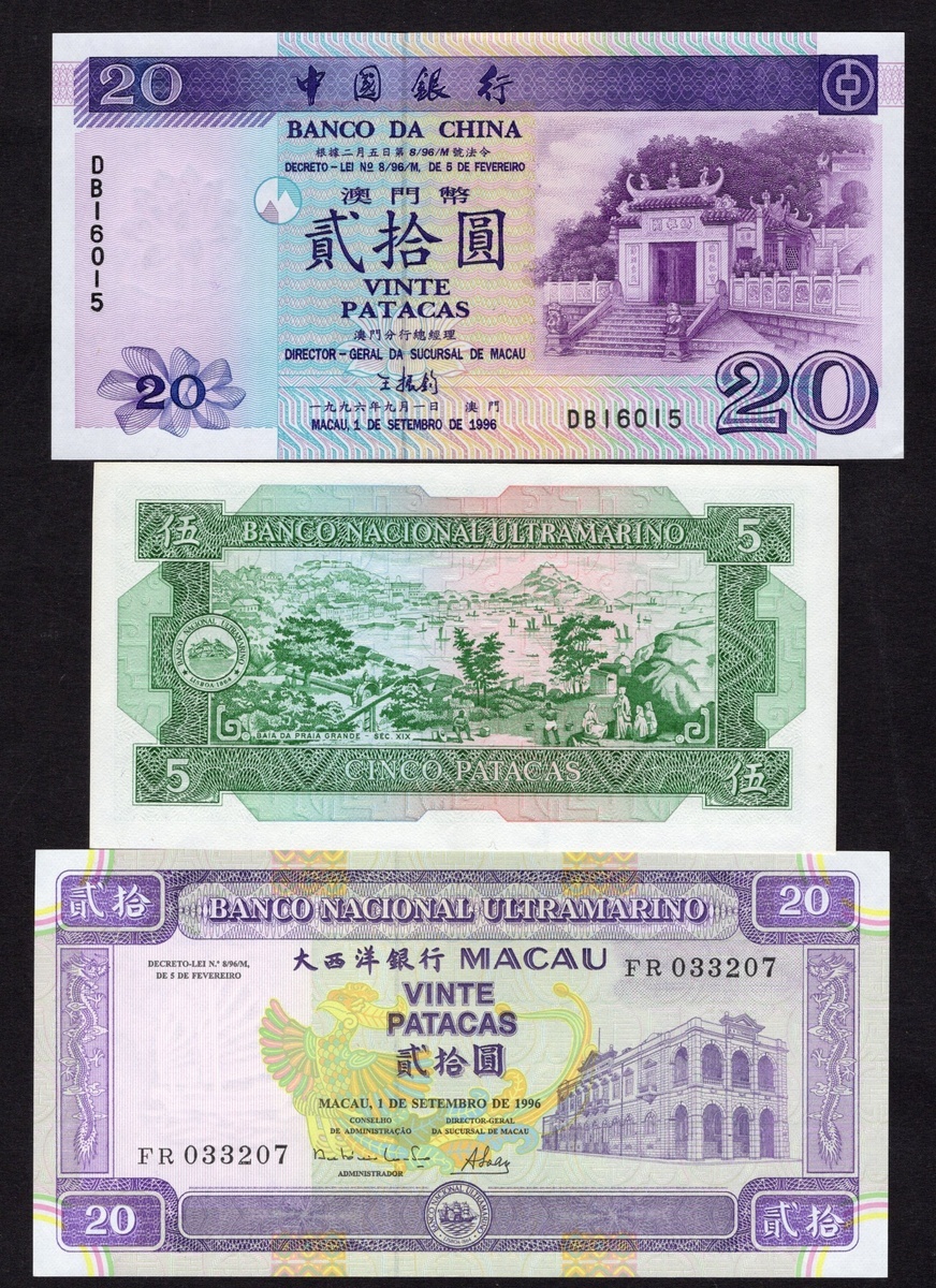 Macau. Lot: Banco Nacional Ultramarino. 5 and 10 Patacas. P-58c, 66; Banco da China. 10 Patacas (11), and 20 Patacas. P-90, 91. Uncirculated. [14]