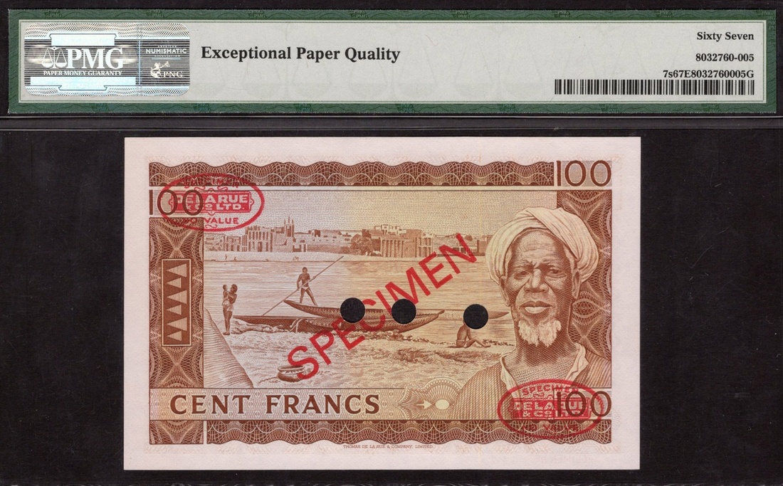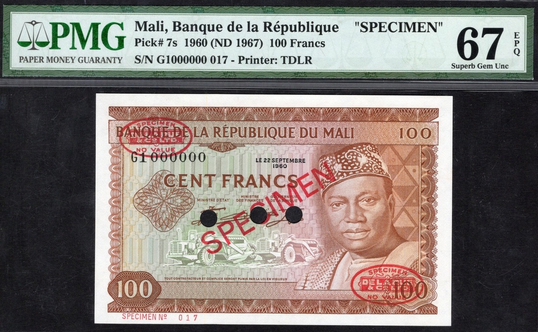 Mali. Banque de la République du Mali. Specimen 100 Francs. 1960 (1967). P-7s. No. G1000000 017. Brown on green and lilac. Modibo Keita at right, tractors lower left; Old man at right, pirogues at center on back. Diagonal red SPECIMEN and De la Rue stamps front and back, three punches. PMG Superb Gem Unc 67 EPQ.