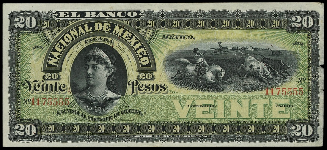Mexico. Banco Nacional de México 20 Pesos. ND. P-S259r. Portrait of M. Garcia Teruel left, cowboys at right; Monument at center. Remainder with BILLETE SIN VALOR in red, diagonally three times on back. Adhesive residue back left edge and small nick. AU.