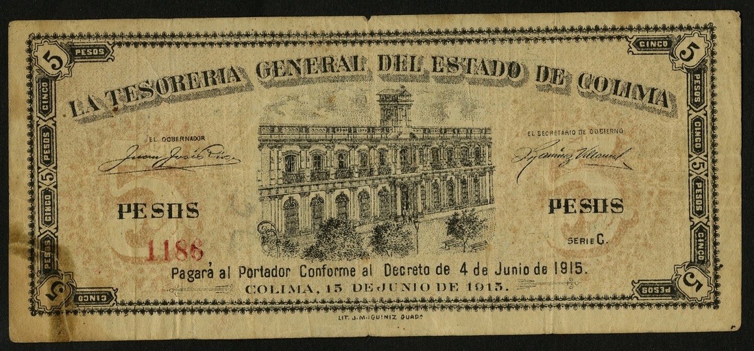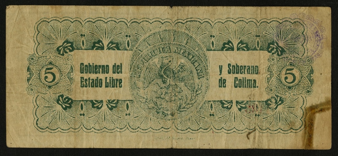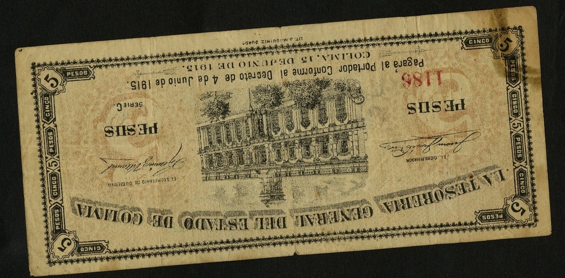 Mexico. Revolutionary. Colima. La Tesorería General del Estado de Colima. 5 Pesos. P-S680. Government building at center. Stain lower left corner. Fine.