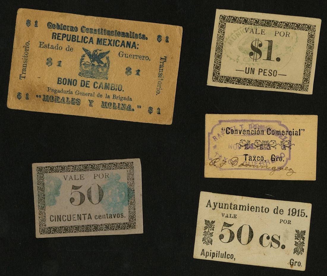 Mexico. Revolutionary. Guerrero. Lot. Ayuntamiento de 1915, Iguala. 50 Centavos and 1 Peso. P-S807, 808. Gray pasteboard; Pale yellow paper. Unc; Gobierno Constitucionalista, Brigada Morales y Molina. 1 Peso. P-S822. Fine; Ayuntamiento de 1915, Apipilulco. 50 Centavos. Gro.19. VF; Convencion Comercial, Taxco. 50 Centavos. Pasteboard. EF. [5]