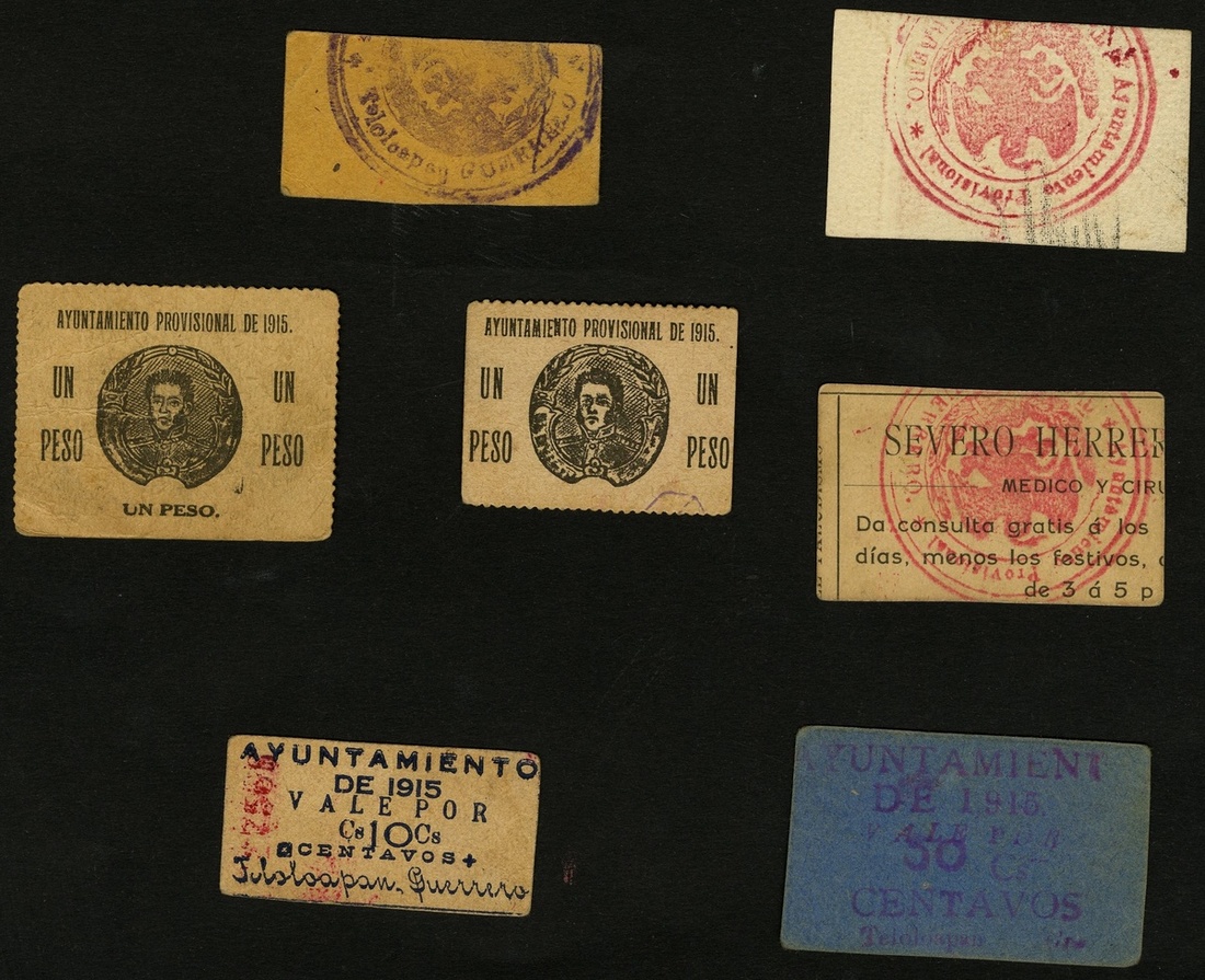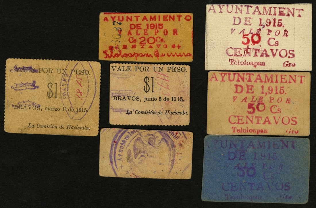 Mexico. Revolutionary. Guerrero. Lot. Ayuntamiento de 1915, Bravos. 1 Peso (2). March 1, 1915 and June 5, 1915. Wreathed portrait. Gro.28, 29. Fine, VF; Ayuntamiento de 1915, Teloloapan. 10 and 20 Centavos; 50 Centavos (3) - white, buff, and blue. Pasteboard. Gro 89, 90, 92. VF-EF. [7]