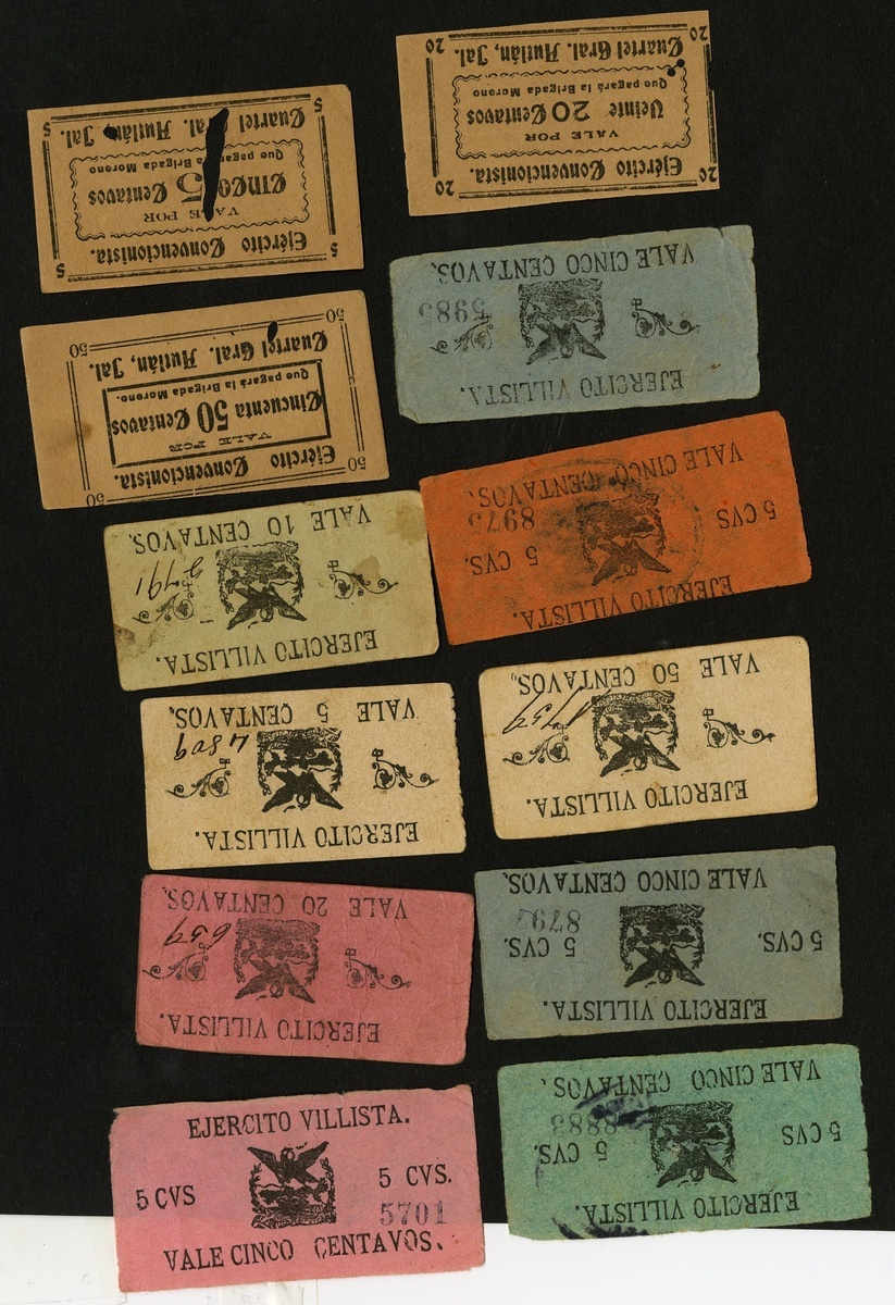 Mexico. Revolutionary. Jalisco. Army issue Small Change Notes Lot. Ejército Villista (Pancho Villa's Army). 5 Centavos (6) - gray (2 with and without numeral value), green, pink, orange, and buff, 10, 20 and 50 Centavos. Gaytan p. 140, P--; Ejército Convencionista - Cuartel Gral, Autlán, Jal., Brigada Moreno. 5, 20 and 50 Centavos. Gaytan Jal.63, 64, 65. The 5 with large slash cancel, the other two with small pin punches. VF-EF. [12]