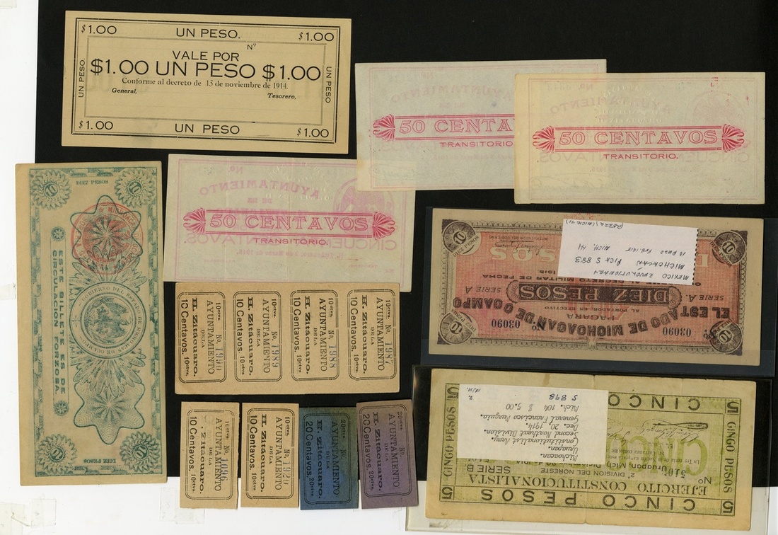 Mexico. Revolutionary. Michoacán. Lot. Morelia. P-S883 (3). EF; Ejército Constitucionalista, Uruapán. P-S898. Fine; Ayuntamiento de la H.Zitacuaro. 10 Centavos. Two single examples and sheet of four. Mich.150; 20 Centavos. Mich.150a (2) varieties - blue and purple; 50 Centavos (3). Mich.151; Cuerpo de Ejército del Noroeste 5th Division Expeditionary Force. 50 Centavos. Mich.152. VF-EF; Columna Galvez Toscano. 1 and 5 Pesos. 1914. Mich.67, 68. AU and About VF.