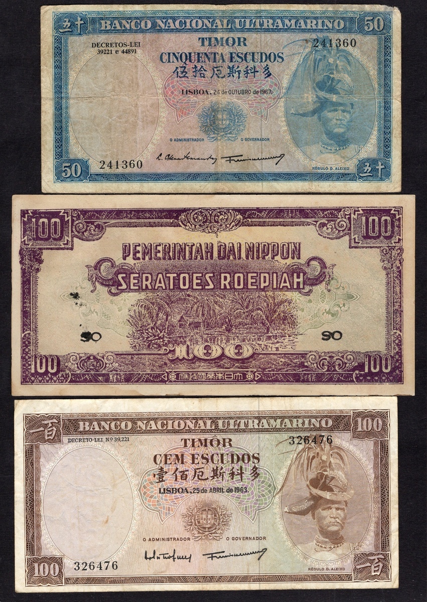 Netherland East Indies. Japanese Occupation. Group: Pemerintah Dai Nippon, 100 Roepiah (2) P-126. Sans serif and serif block letters. EF; Dai Nippon Teikoku Seihu. ½, 1, 5and 10 Roepiah. P-128, 129, 130, 131 EF-AU, the third Uncirculated; and Timor. Banco Nacional Ultramarino. 20, 50 Escudos, 1967, and 100 Escudos, 1963. P-26-28. VG-Fine, the latter VF. [9]