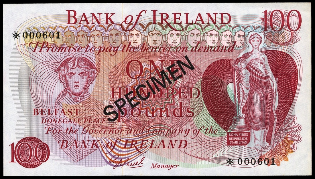 Northern Ireland. Bank of Ireland, Belfast. Specimen 100 Pounds. P-64bs. +000601. O'Neill signature. Red on multicolor. Mercury head left, Hibernia right; Airplane, bank building and ship. AU.
