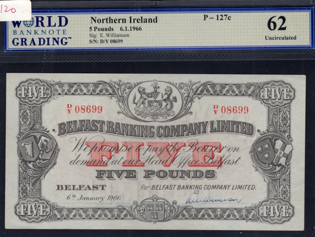 Northern Ireland. Belfast Banking Company Limited. 5 Pounds. Belfast, 6 January 1966. P-127c. Red serial no. D/Y 08699. Black on red. Arms upper center. WBG Uncirculated 62.