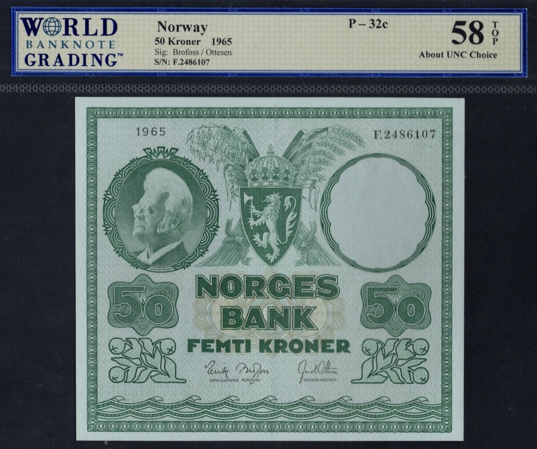 Norway. Norges Bank. 50 Kroner. 1965. P-32c. No. F.2486107. Signed: Brofoss-Ottesen. Dark green. B. Bjornson portrait left, arms at center; Harvest scene on back. WBG About Unc. Choice 58 TOP.