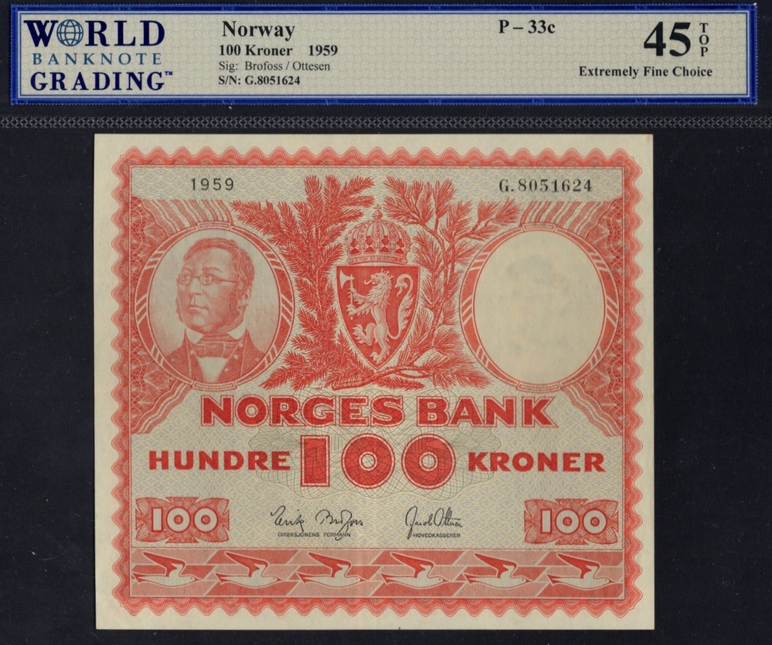 Norway. Norges Bank. 100 Kroner. 1959. P-33c. No. G.8051624. Signed: Brofoss-Ottesen. Red. H. Wergeland portrait left, arms at center; Logging scene on back. WBG Extremely Fine 45 TOP.