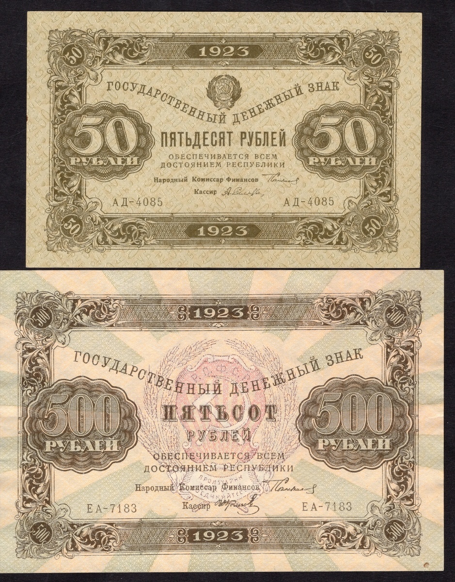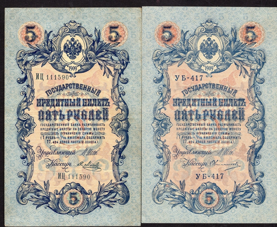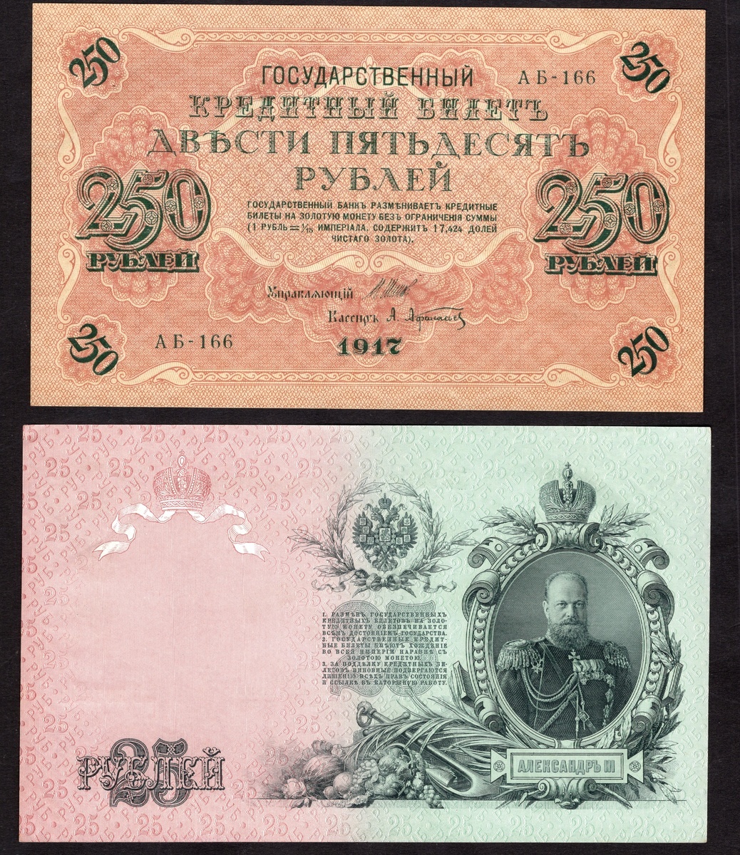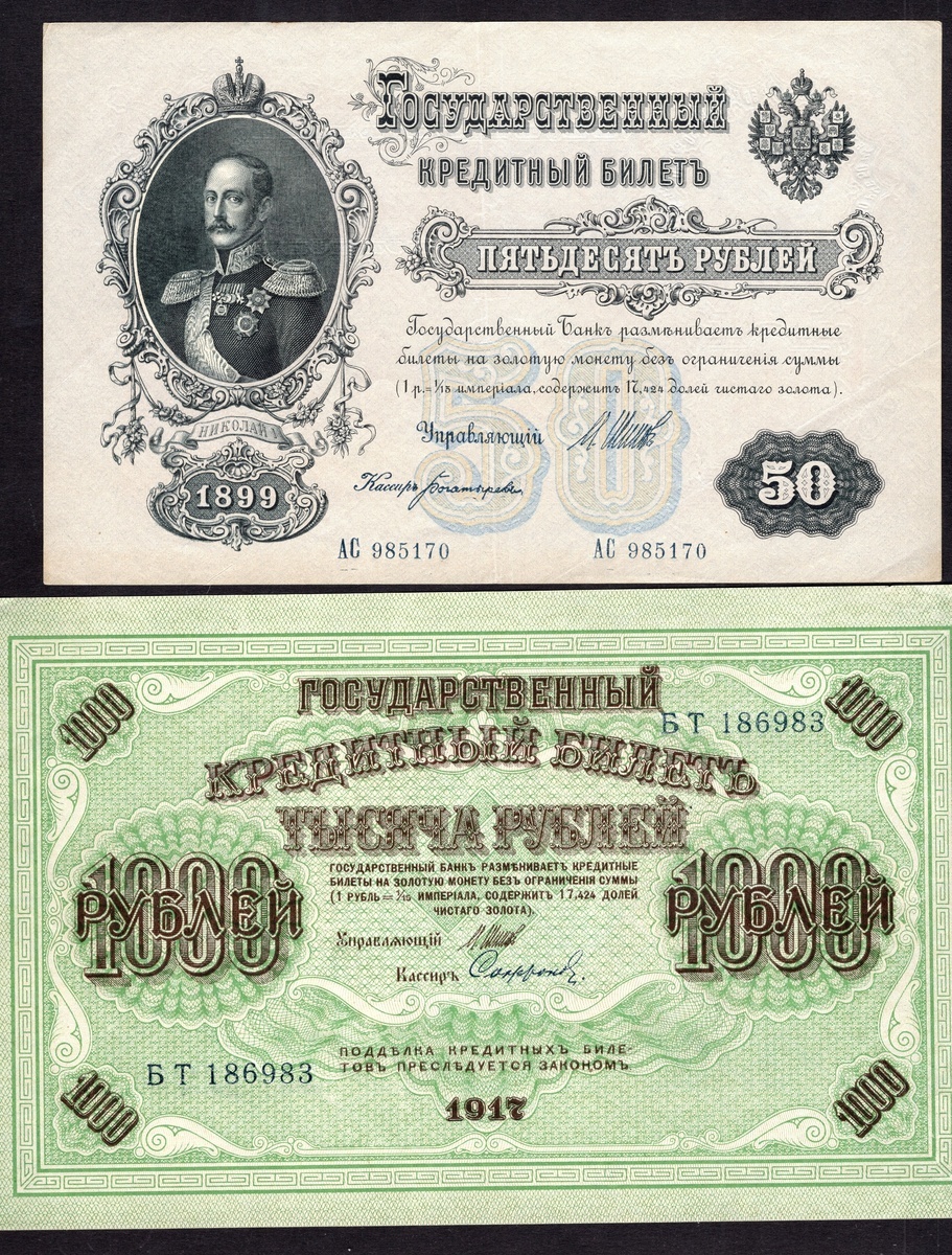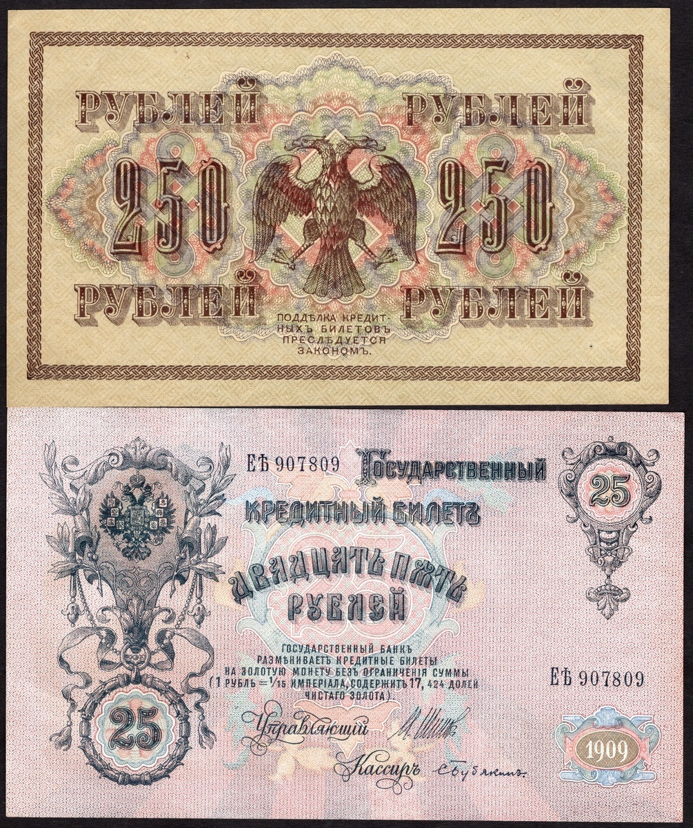 Russia. Lot of banknotes, 1899-1918. Imperial. State Credit Notes. 1-500 Rubles, 1896-1912. P-1d, 8d, 9c, 10b (2), 11c, 12b, 13b, 14b; Government Credit Notes. 250 and 1000 Rubles. 1917. P-36, 37; 25 and 100 Rubles. 1918. P-39Aa, 40a; Treasury Notes. 20 and 40 Rubles. ND (1917). P-38, 39; and State Currency Notes. 50 and 500 Rubles. 1923. EF-Uncirculated. [17]