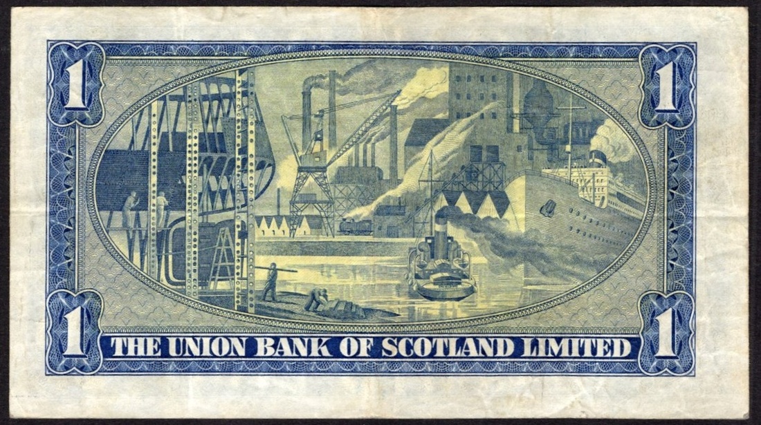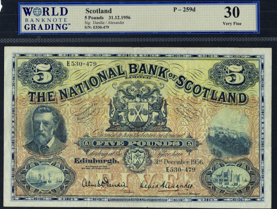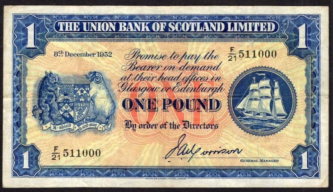 Scotland. Pair of notes: National Bank of Scotland. 5 Pounds. Edinburgh, 31 December 1956. P-259d. Marquess of Lothian portrait at left, arms at center, Edinburgh Castle at right. WBG Very Fine 30, margin tear; and Union Bank of Scotland Limited. 1 Pound. 8 December 1952. P-S816a. Arms left, sailing ship at right. Very Fine. [2]