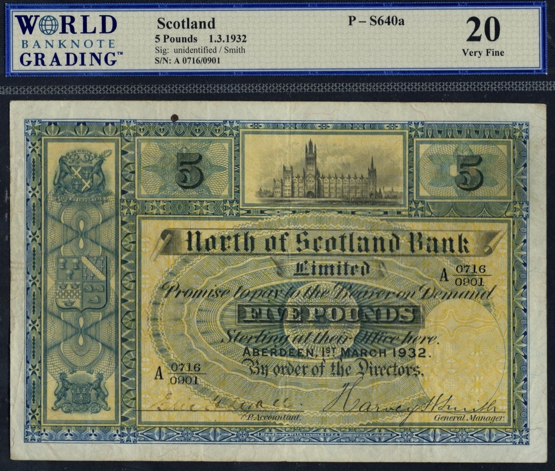 Scotland. North of Scotland Bank Limited. 5 Pounds. Aberdeen, 1 March 1932. P-S640a. No. A 0716/0901. Black, blue and yellow. Marischal College upper center. Very Fine 20.