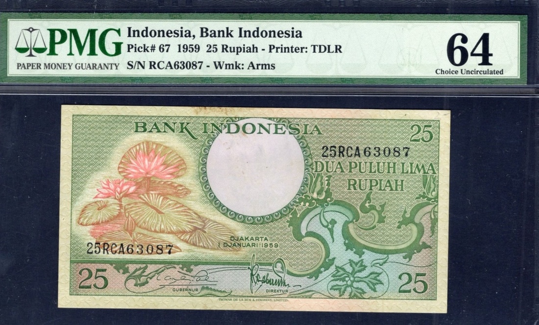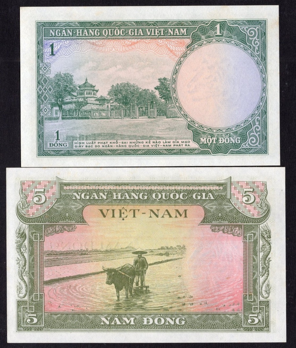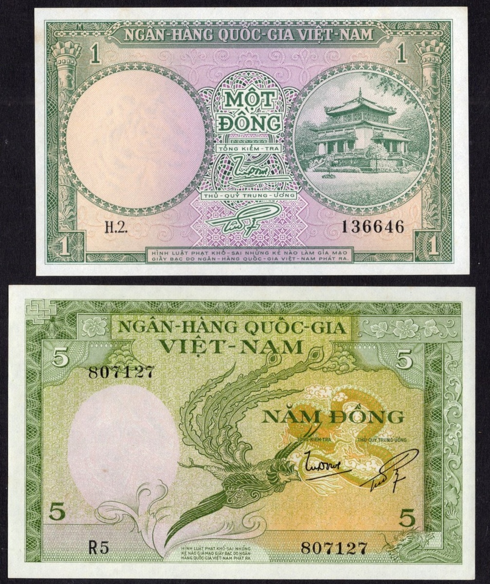 South Vietnam. National Bank of Vietnam. 1955-1962 Lot. P-5-6, 7-9, 11-13. Generally AU-Unc; also Indonesia. Bank Indonesia. 25 Rupiah. 1959. P67. PMG Choice Uncirculated 64. [13]