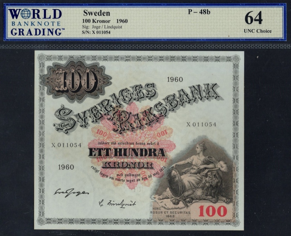 Sweden. Sveriges Riksbank. 100 Kronor. 1960. P-48b. No. X 011054. Black, gray, red and light brown. Svea seated lower right; Gustav Vasa portrait on back. WBG Unc Choice 64.