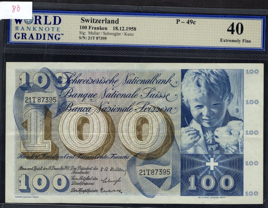 Switzerland. Schweizerische Nationalbank. 100 Franken. 18 December 1958. P-49c. No. 2IT87395. Dark blue and brown-olive on multicolor. Boy with lamb at right; St. Martin sharing his cape on back. WBG Extremely Fine 40.