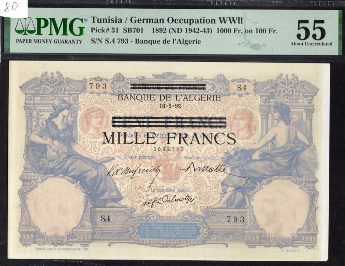 Tunisia. German Occupation-WWII. Banque d'Algerie. Provisional Issue. 1000 Francs. (1942-43). P-31. No. S.4 793. Violet, blue and brown. Bank name and new denomination overprinted on unissued Banque de France 100 Francs note. Allegorical women seated left and right. PMG About Uncirculated 55.